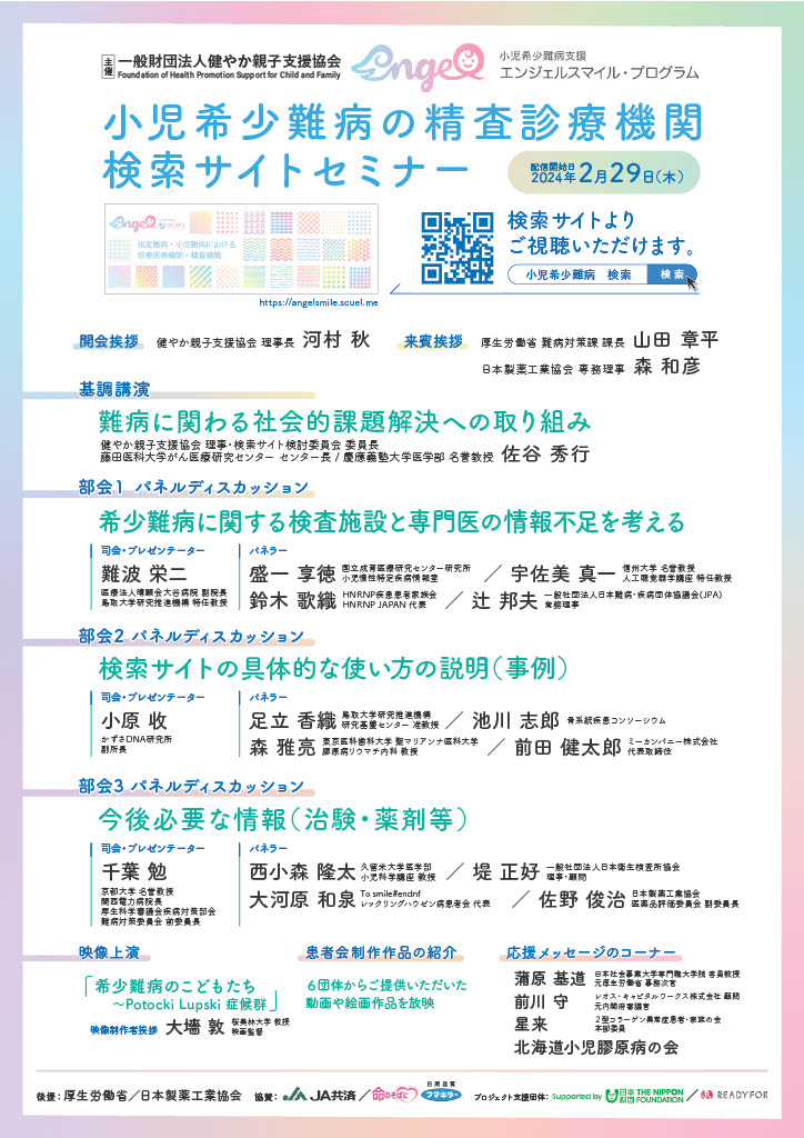 本サイトは「小児希少難病の精査診療機関検索サイト事業」として、各種学会・患者会の支援を通じ、一般財団法人健やか親子支援協会がミーカンパニー株式会社の協力を得て、共同で事業を運営しています。